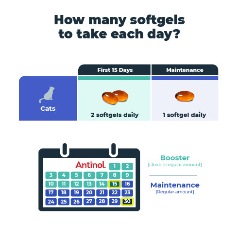 It depends on the size of your cat and if your cat is new to AntinolⓇ, it’s really important that you double the softgels for the first 15 days. This gets them off to the best start possible, with the most dramatic results.